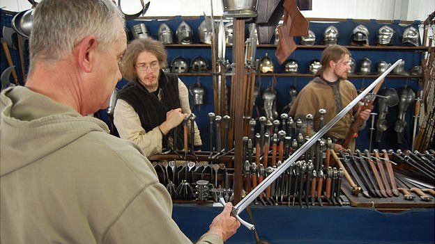 A prospective customer is encouraged to take a medieval sword and "try it for size"